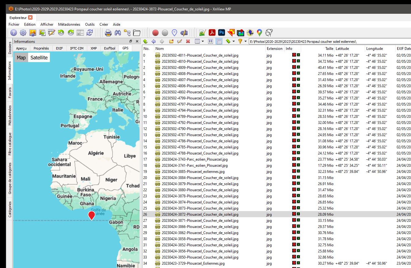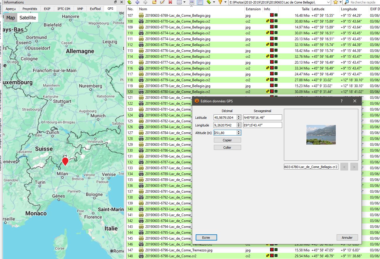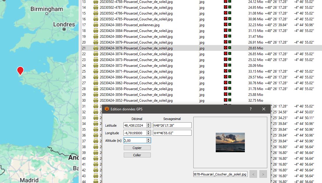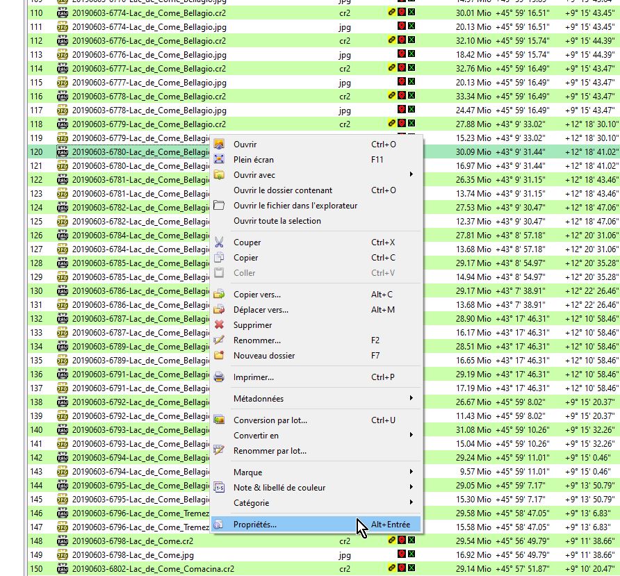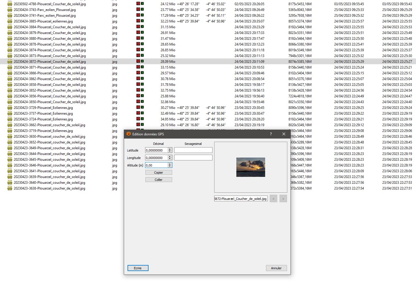 Dans cette série de photos, l’cône GPS est présent pour chaque photo, mais en regard pour certaines il n'y a aucune donnée enregistrée. Non visibles dans les colonnes de l'explorateur mais des zéros dans la partie décimale du paramétrage.