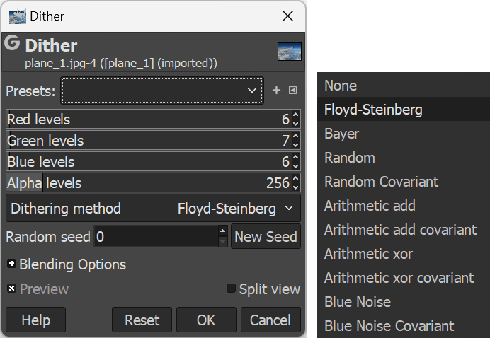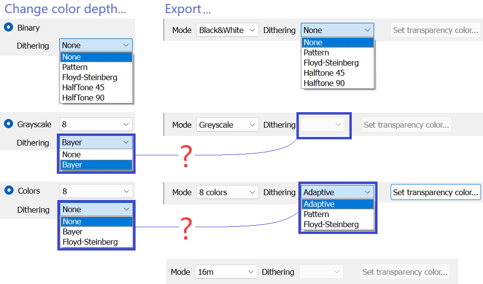 Dithering options are different for Indexed colors and Grayscale in 'Change color depth...' and 'Export...' dialogs