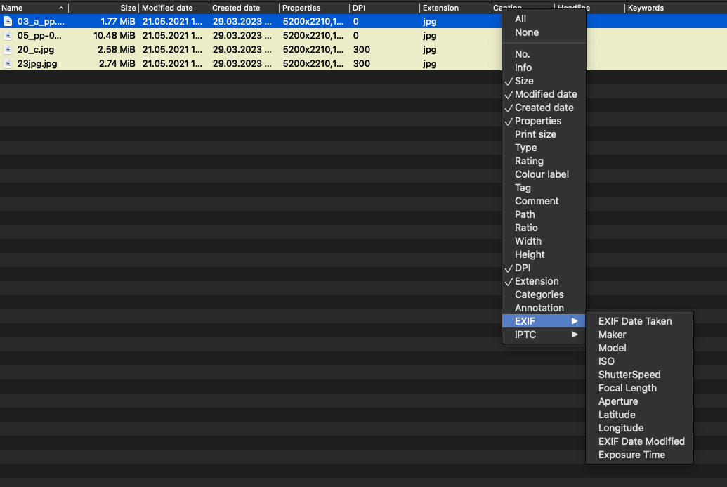 from IPTC?Delizade wrote: Fri May 03, 2024 8:46 am 1) When I wanted to list images and see their captions and keywords in Detail List mode, I can't see those data. But If I select one image, I can see description and keywords of the selected image in the Info panel. I need to see all images' descriptions and keywords in the list view. Why those data can't be seen in Detail List mode?