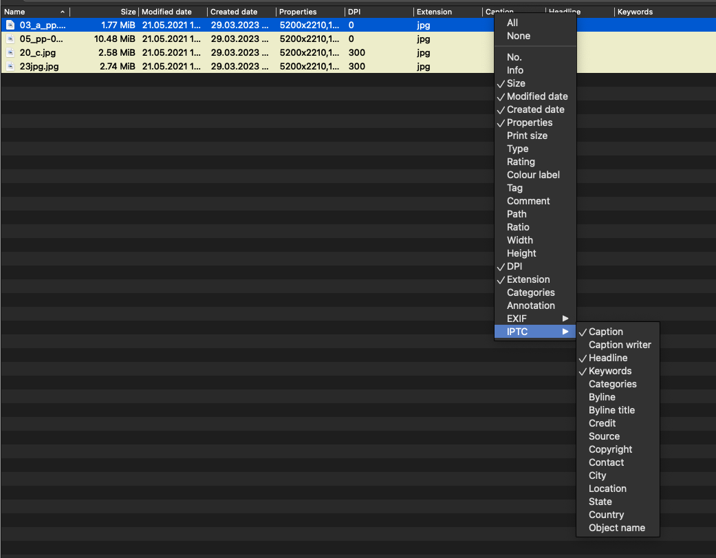 I could select IPTC caption and keywords for the columns but they are empty in the list.