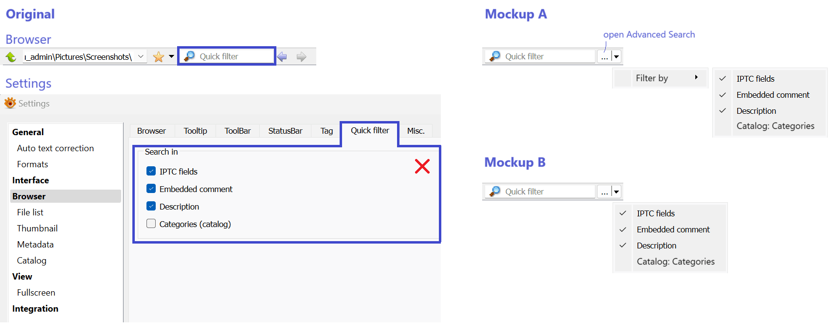 ps: tbh, I would prefer much simpler approach - quick filter by filename only and use Advanced Search for the rest.
