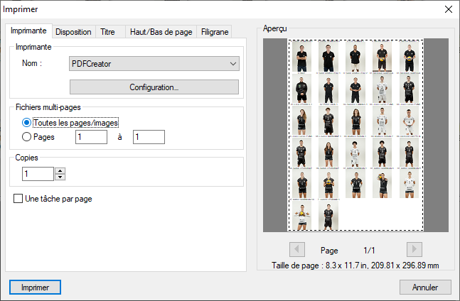 Le logiciel réunit toutes les photos (chacune est un fichier jpg) et les présente sous la forme de plusieurs pages que j'imprime ensuite en pdf.