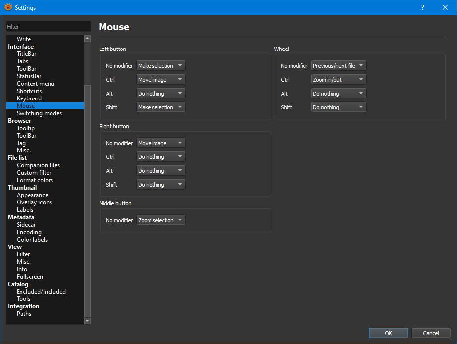 The problem is that "no modifier" seems only to look at Ctrl, Shift, Alt to assess whether there is a modifier or not, so if e.g. you try to do Ctrl-Wheel in order to Zoom but miss the Ctrl key and hit the one beside, e.g. ContextMenu, xnview thinks the Wheel isn't modified and so carries out the not-modified act (e.g. scrolling through files) when in fact it is modified, just not with Ctrl Shift or Alt but with ContextMenu.