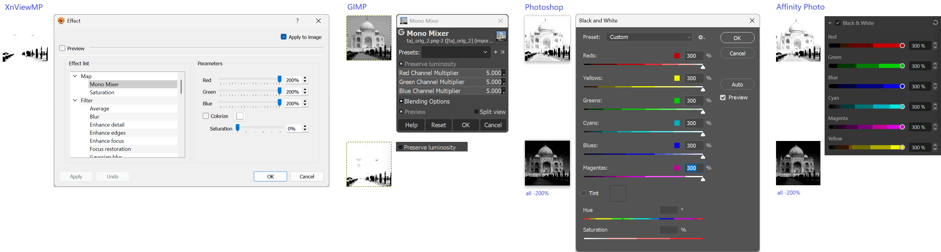 see instrument effect intensity at min/max in GIMP (☑ Preserve luminosity) and Photoshop test imagehttps://docs.gimp.org/2.10/en/gimp-filter-mono-mixer.html wrote: Preserve luminosity