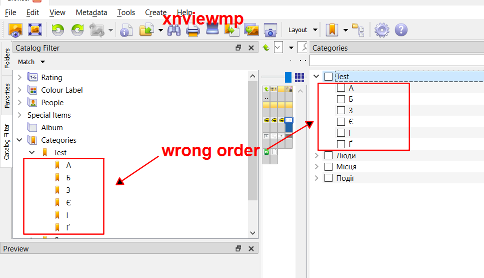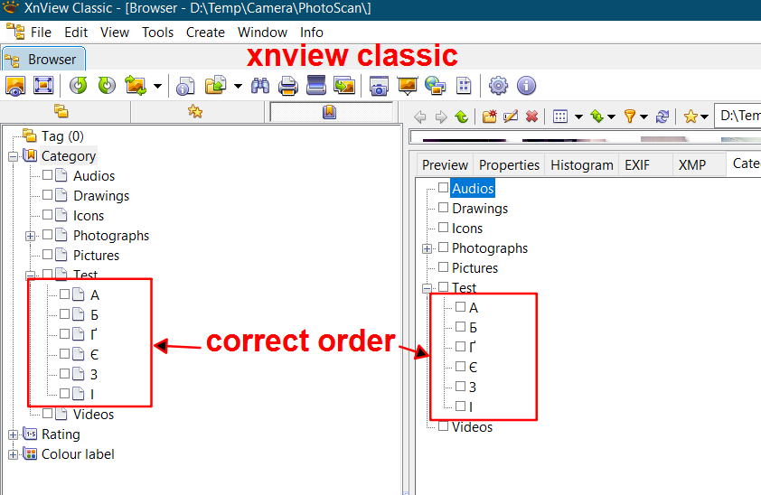 2. these are the same categories after XnViewMP restart, the sorting is different from the first screenshot but is also wrong