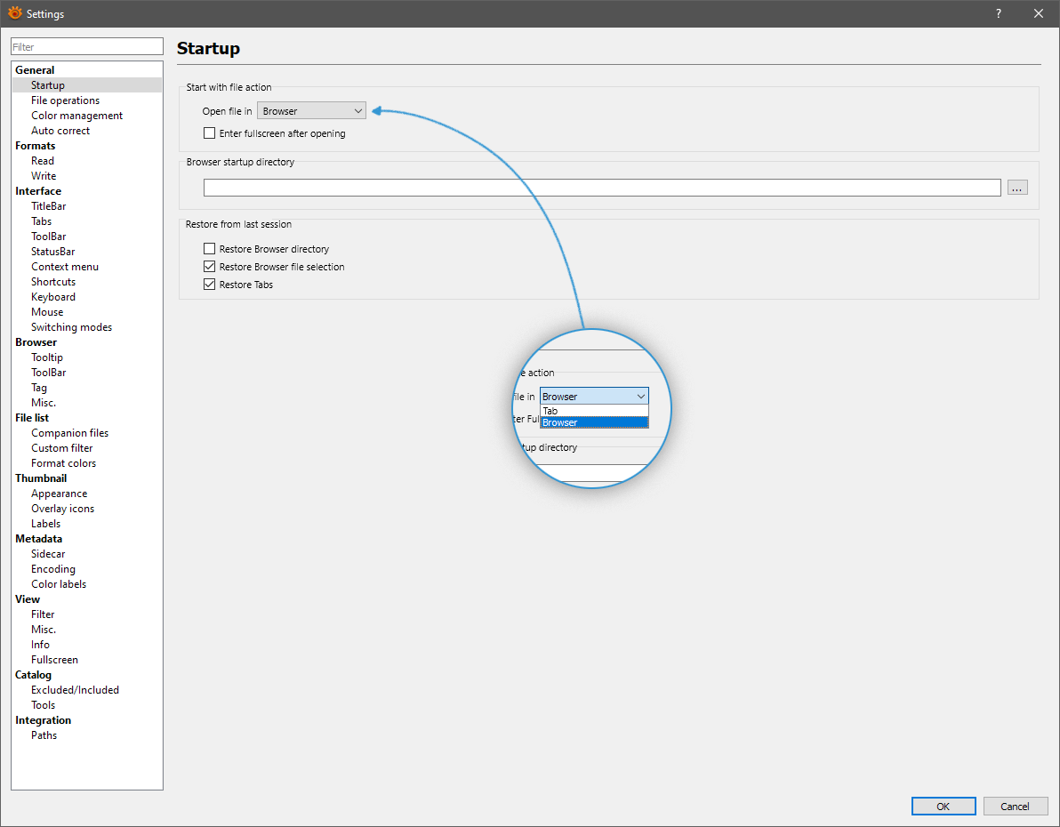 • 1 tab @ file + previous tabs + Browser @ empty directory (currently not possible in XnView) works via "Purge 'Recent files and folders' on exit"