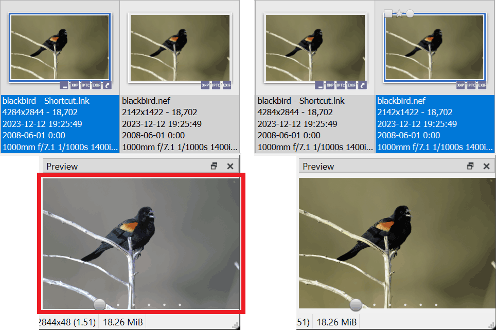 1. have raw file in folder (eg blackbird.nef, 19Mb [source]) + its shortcut