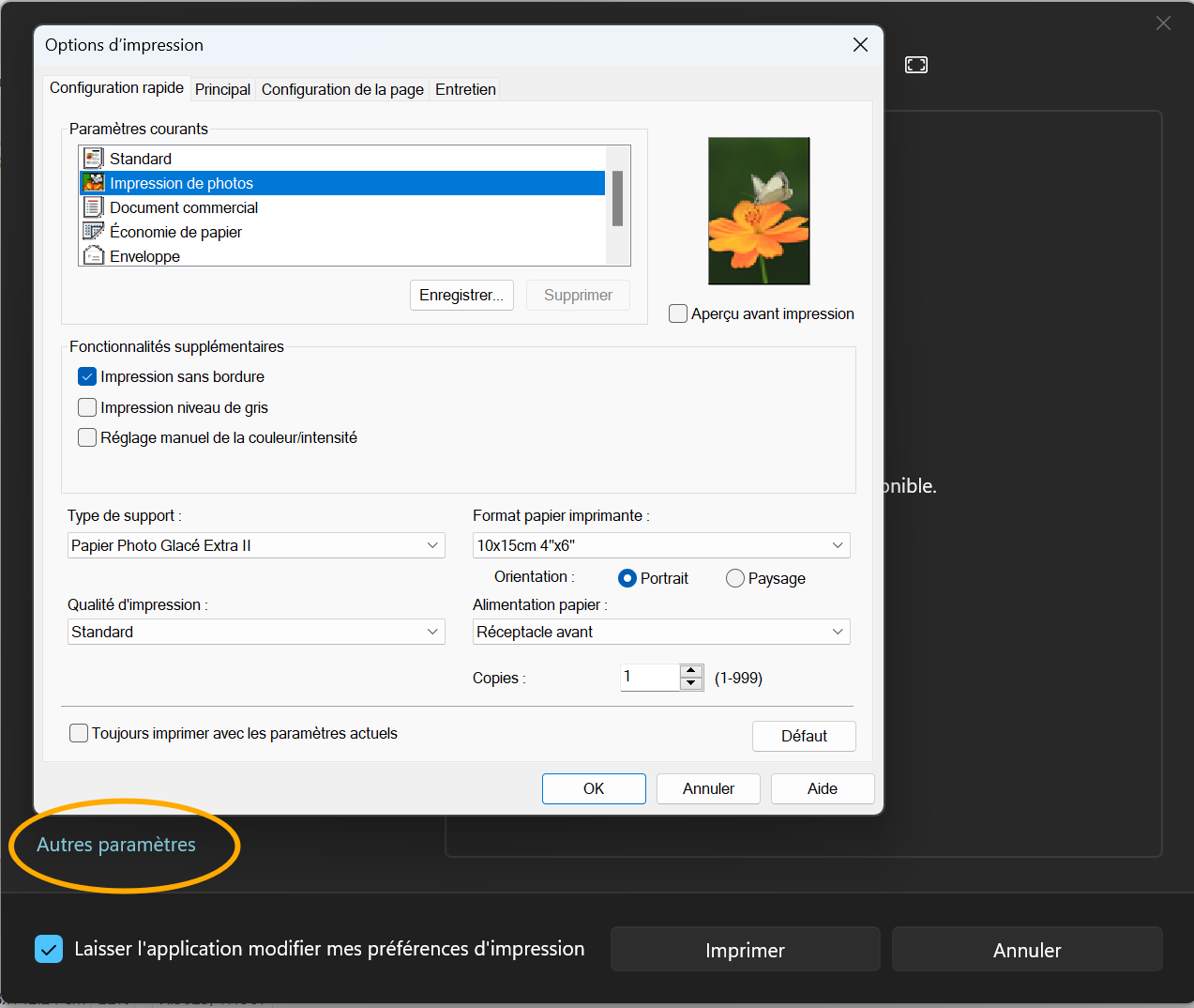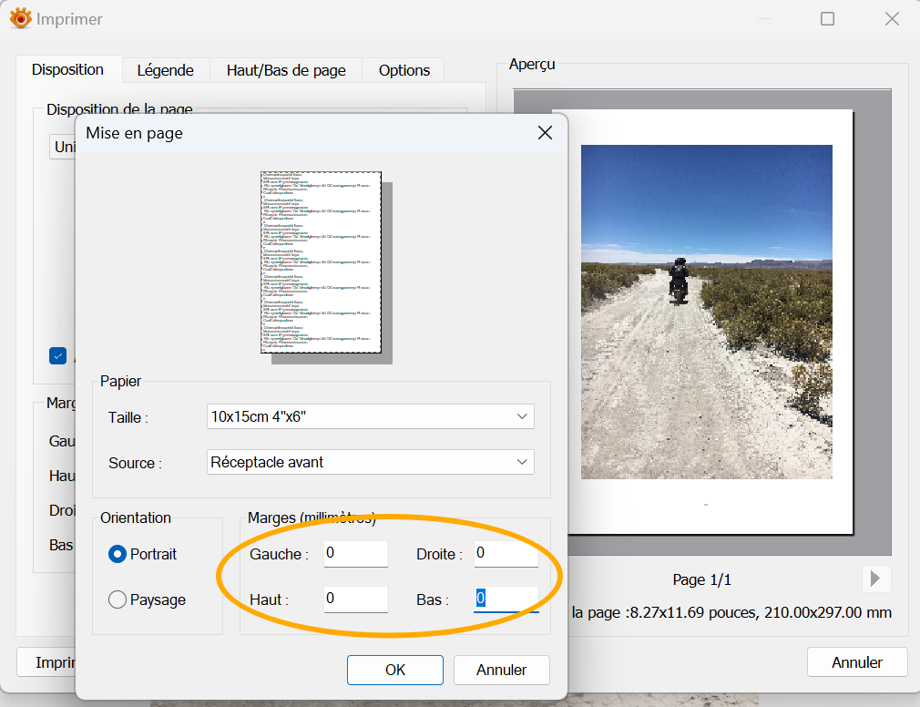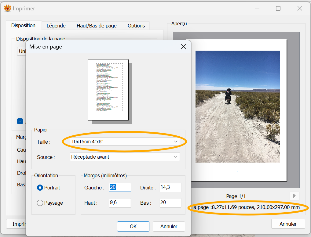 I wanted to print a single image on a photo paper (classical 10x15 cm). I did it already in the past, from my desktop (old Windows 7, same printer but connected via USB) and I know changing the paper size / type / borders,... on XnView MP requires an unusual workflow but this time it's just impossible (is it Win'11? is it the remote connection ?). I don't have such problems with other apps (Acrobat Reader, Firefox, LibreOffice...).