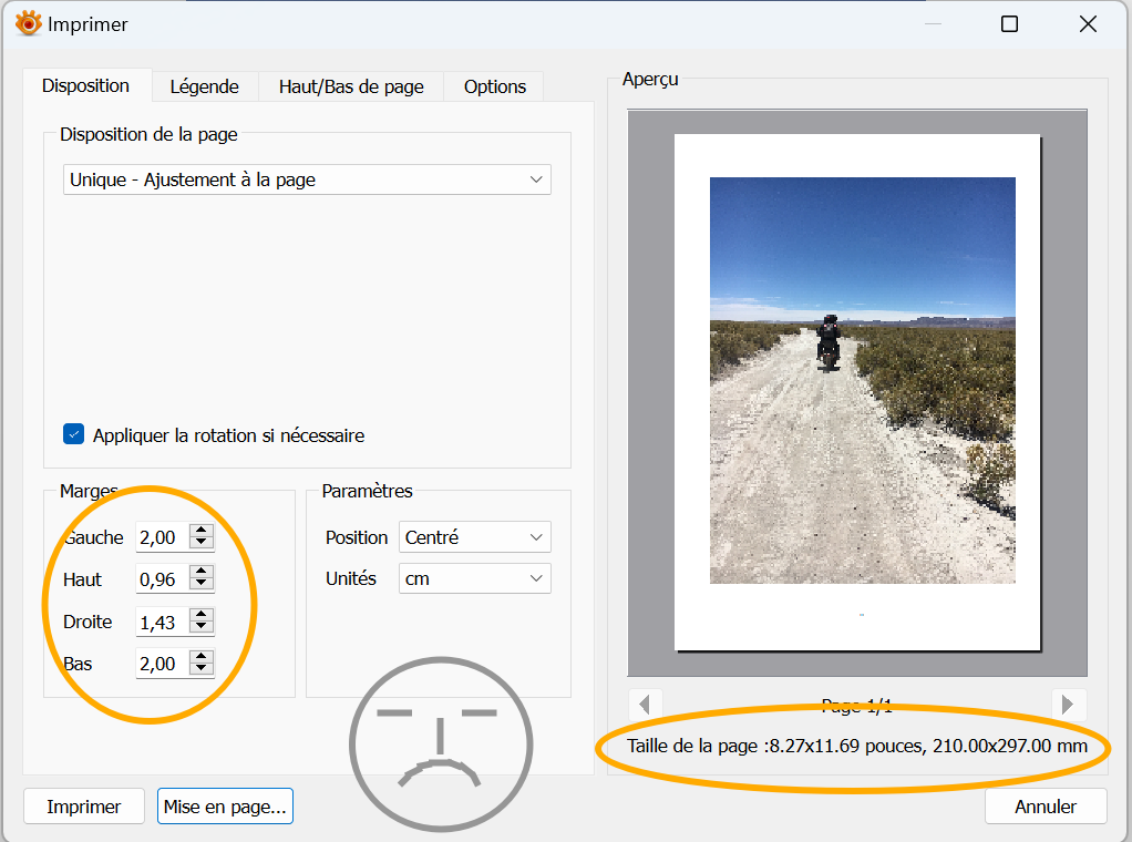 Step 6- Back to the System print dialog - 2 options: Print (but the picture may have not been positionned correctly or cancel but then all settings are gone)