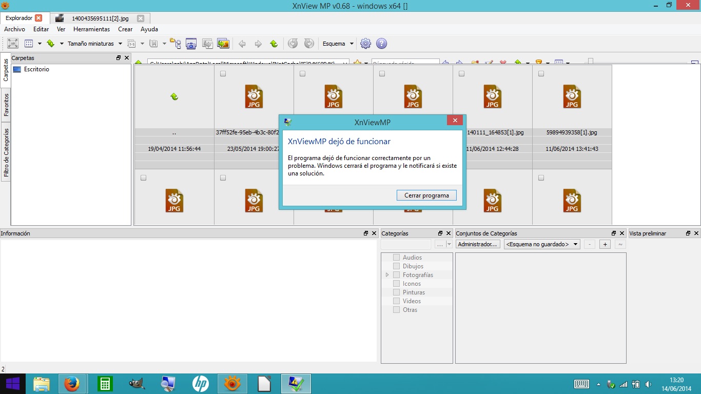 5. XnView openn, then crash. An error windows appear "XnViewMP dejo de funcionar"(spanish) and the only option is to "close".