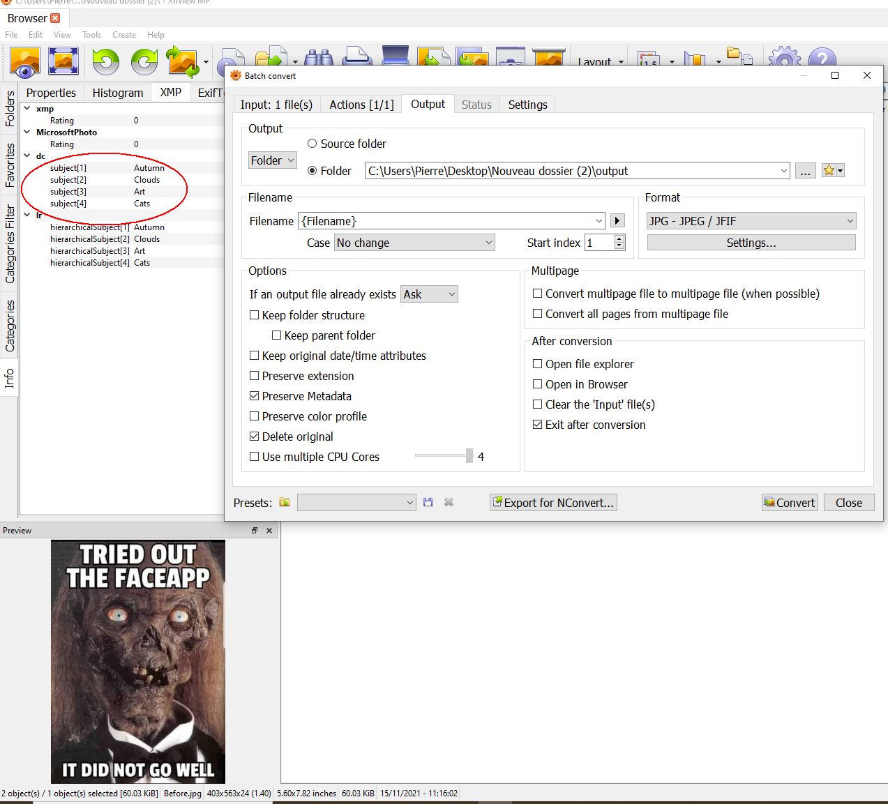 xnview wrote: Mon Nov 15, 2021 10:28 am I've tried your xnview.ini, but 'keep metadata' was disabled so XMP metadata are not copied.