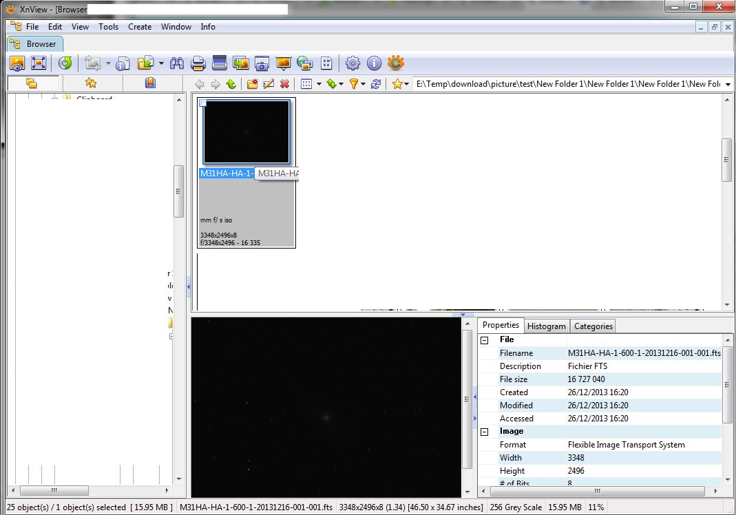 XnviewMP allows opening files separately by double click, and full-screen view. But the FITS files appear very dark, with no stretch. Obviously the FITS files are not decoded in the same way in the 2 programs ? Not possible to use it as is.