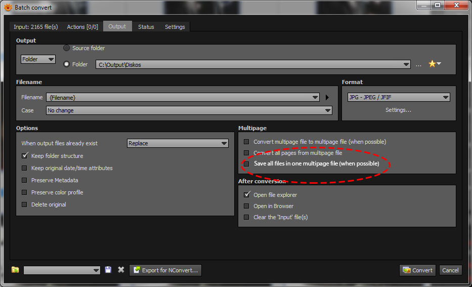When the highlighted checkbox will be checked and a compatible output format is chosen, the Batch Convert will generate just one output file having as pages the processed input images.