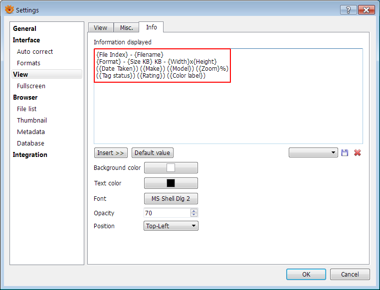 All the other default 'Information displayed' parameters in the above screenshot of my unmodified XnViewMP 0.68 copy 'View > Info' settings seem to be listed in Insert >> , so the omission is probably an oversight...Alexview wrote: ... Are there maybe more unlisted functions?