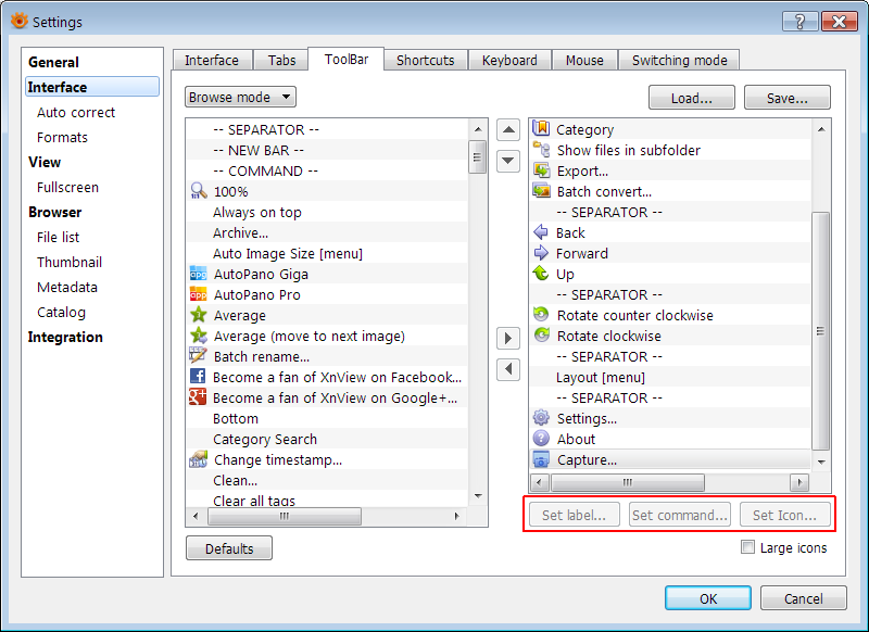 emdx ([url=http://newsgroup.xnview.com/viewtopic.php?p=121228#p121228]Context menu/menu/toolbar icon to launch external program[/url]) wrote:But on XnViewMP, you have to go to Tools → Settings → Interface → Toolbar, then add a “-- COMMAND --”, then click on the “Set Label…” button to set the label, click on the “Set command…” to set the command, and “Set Icon…” to set the icon.