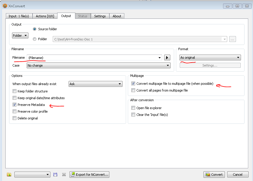 output on the source folder with filename - > {Filename} - > Convert multiple file to multiple file -> Preserve meta data