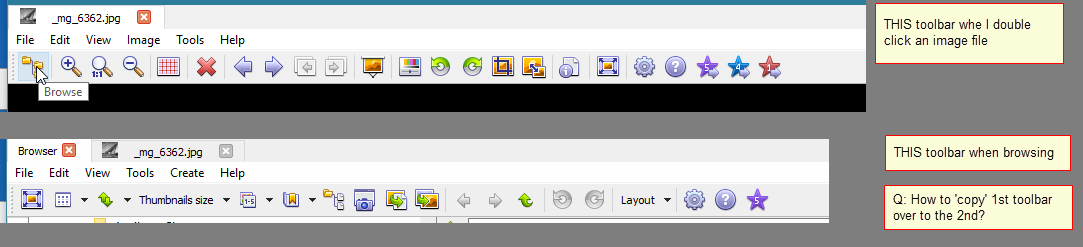 There is a difference between the toolbar after double clicking an image file (viewer toolbar?)