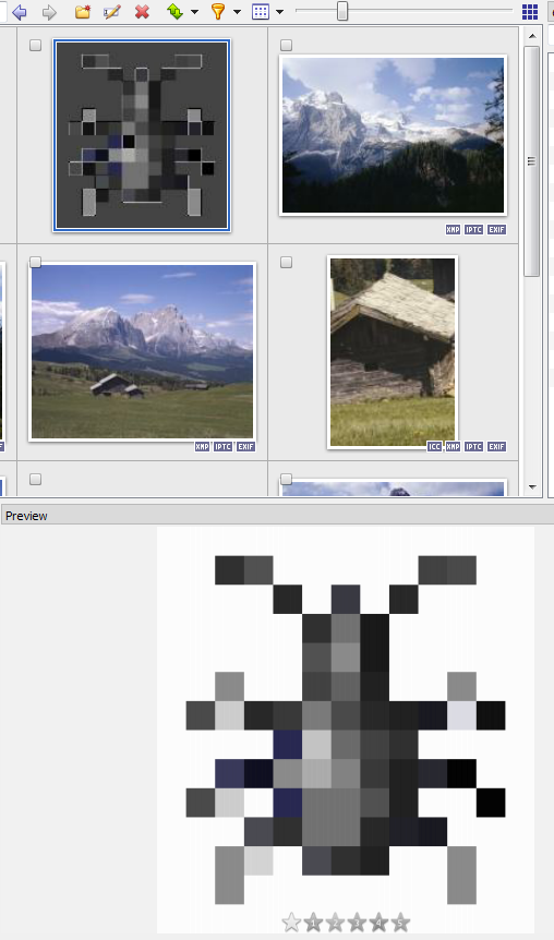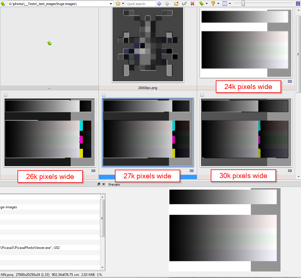 Actual behaviour (bug): XnView builds the thumbnail. Thumbnail do not look the same: The thumbnail of the large image looks dark in brightness and somehow corrupted.