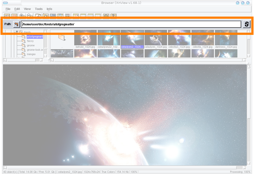 I'm attaching someone's screenshot for . . . oh wow! it's the Browser for XnView 1.68.1! Ironically it demonstrates a feature that I hope MP might allow for: an open path bar where I can parole my long-suffering mouse and rocket around on my keyboard with an assist from cut/paste. I have 21 drive partitions on the particular computer in question and prize a plain, easy-to-read path string — however obscenely long it might be — in a toolbar that has its own dedicated row. Yes tabs are fantastic. I still want the path bar (probably related to my genetic predisposition for flip cellphones).