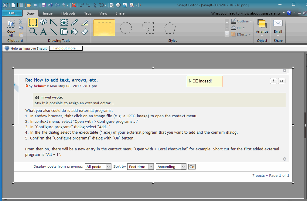 A Draw tool was added to XnView MP in 0.85: Image > Draw... or use the icon added to the Toolbar...mrwul wrote:When in viewer mode, I'd like to add text to images.
