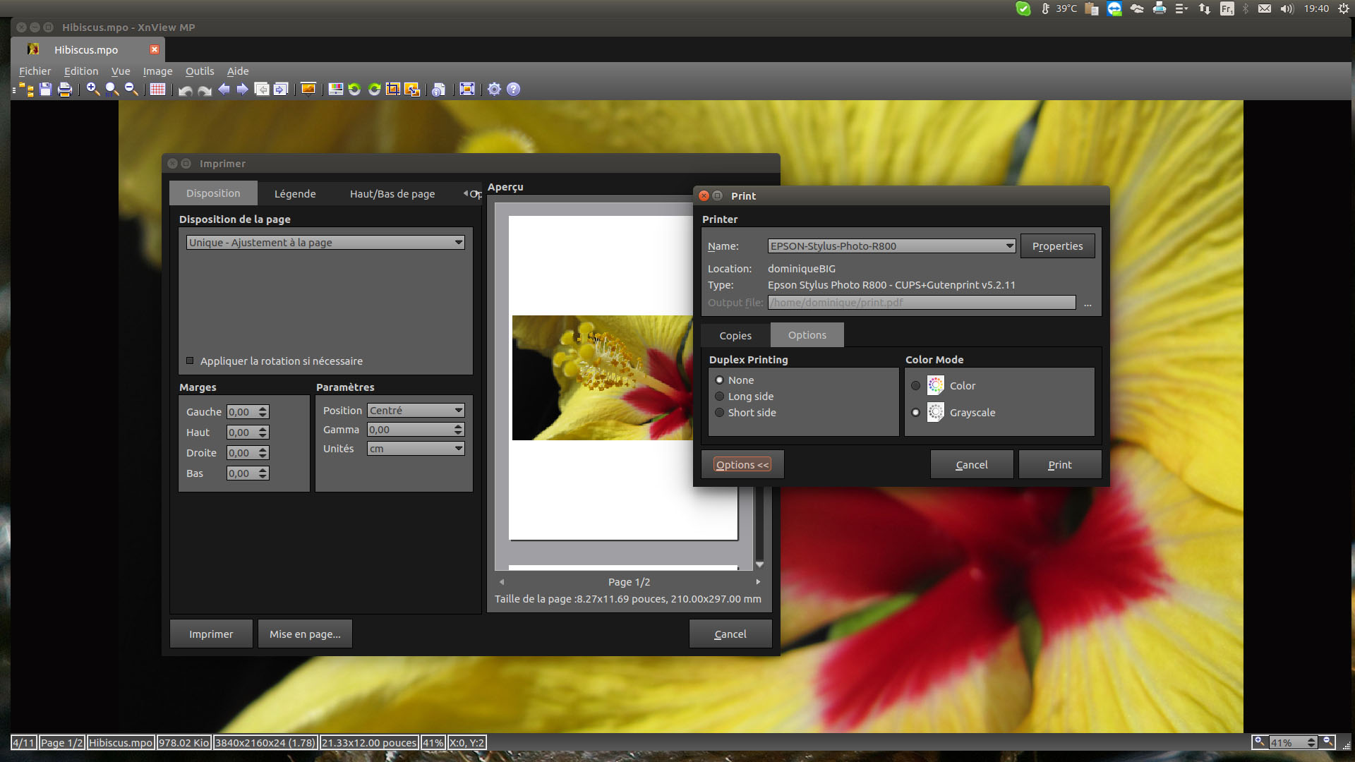 In Ubuntu, when printing a picture, I must always verify the color option of XnView MP for the printer (Epson R800), because it is always set by default on "greyscale".