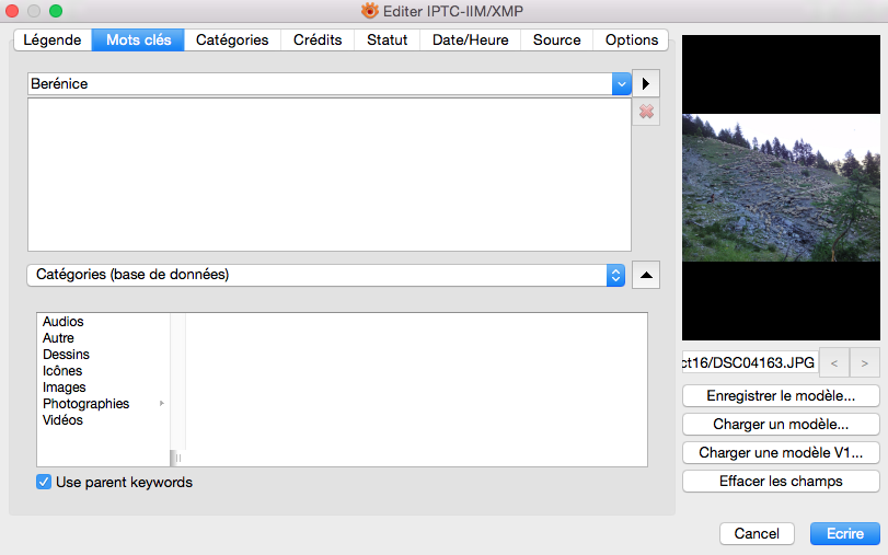Edition IPTC, j'ajoute un mot clé, puis ecrire