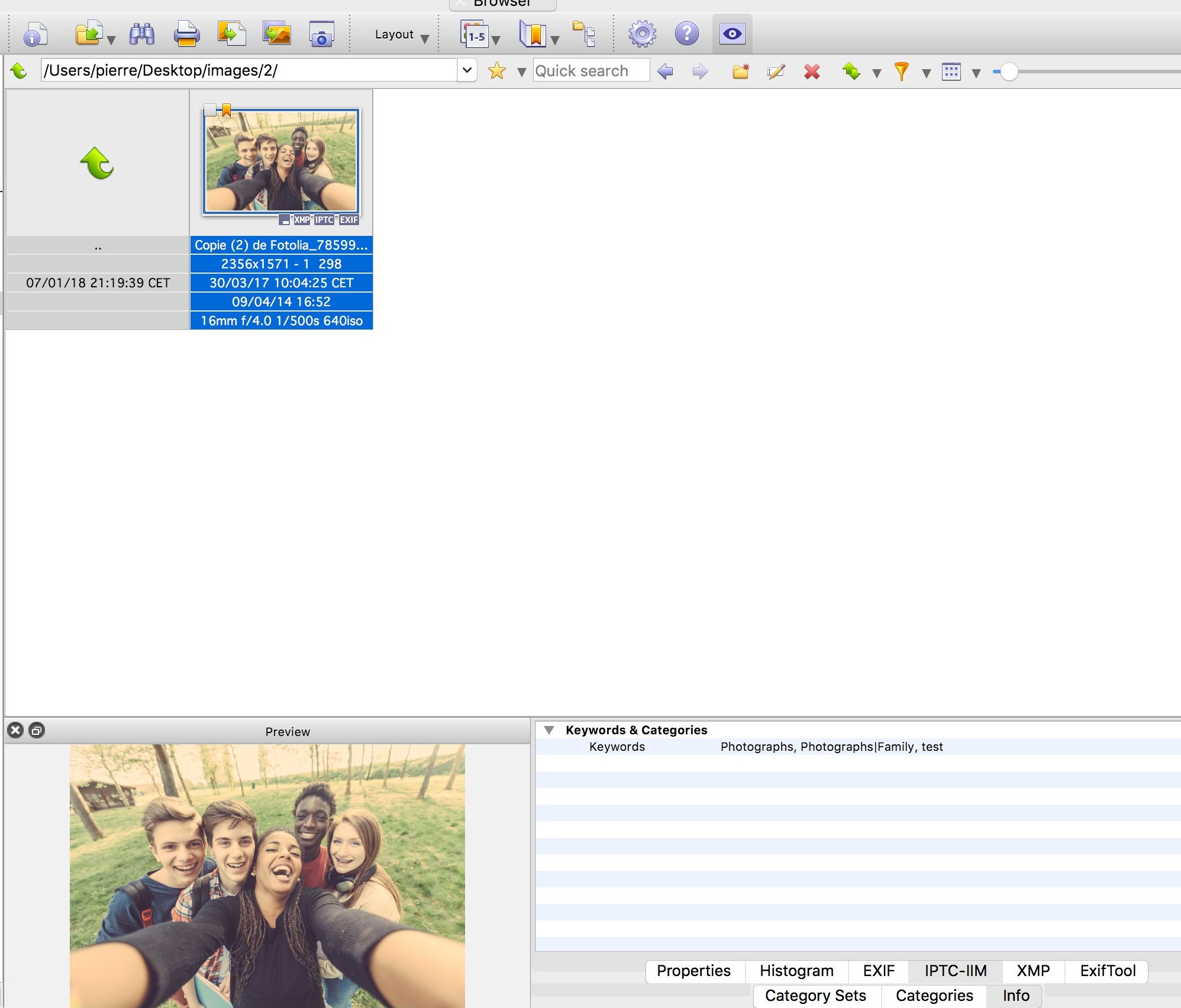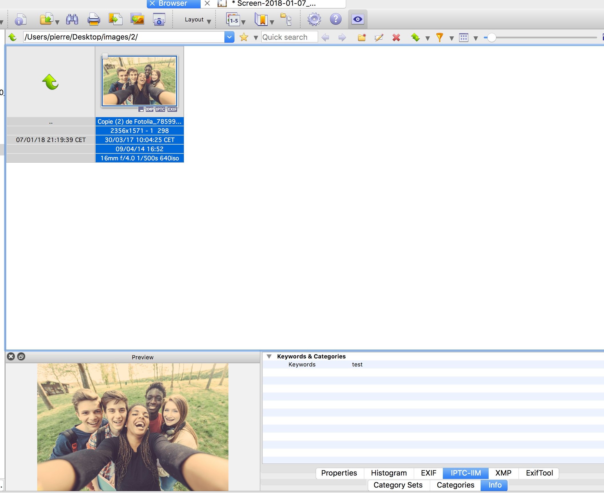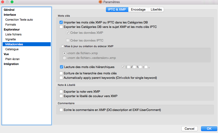 L'indexation via le panneau "catégories" fonctionne, et je le vérifie en cliquant sur "informations" et l'onglet IPTC.