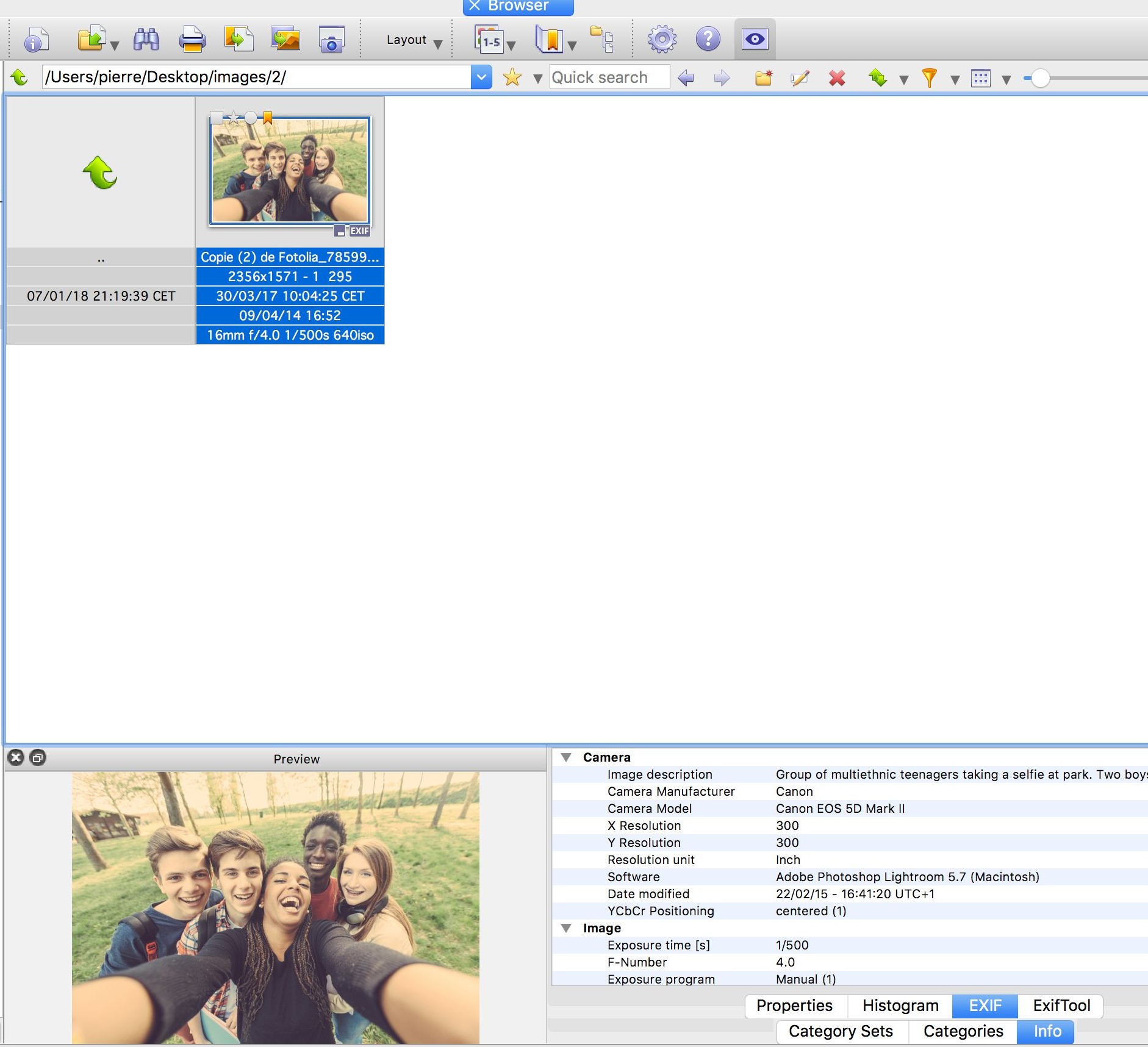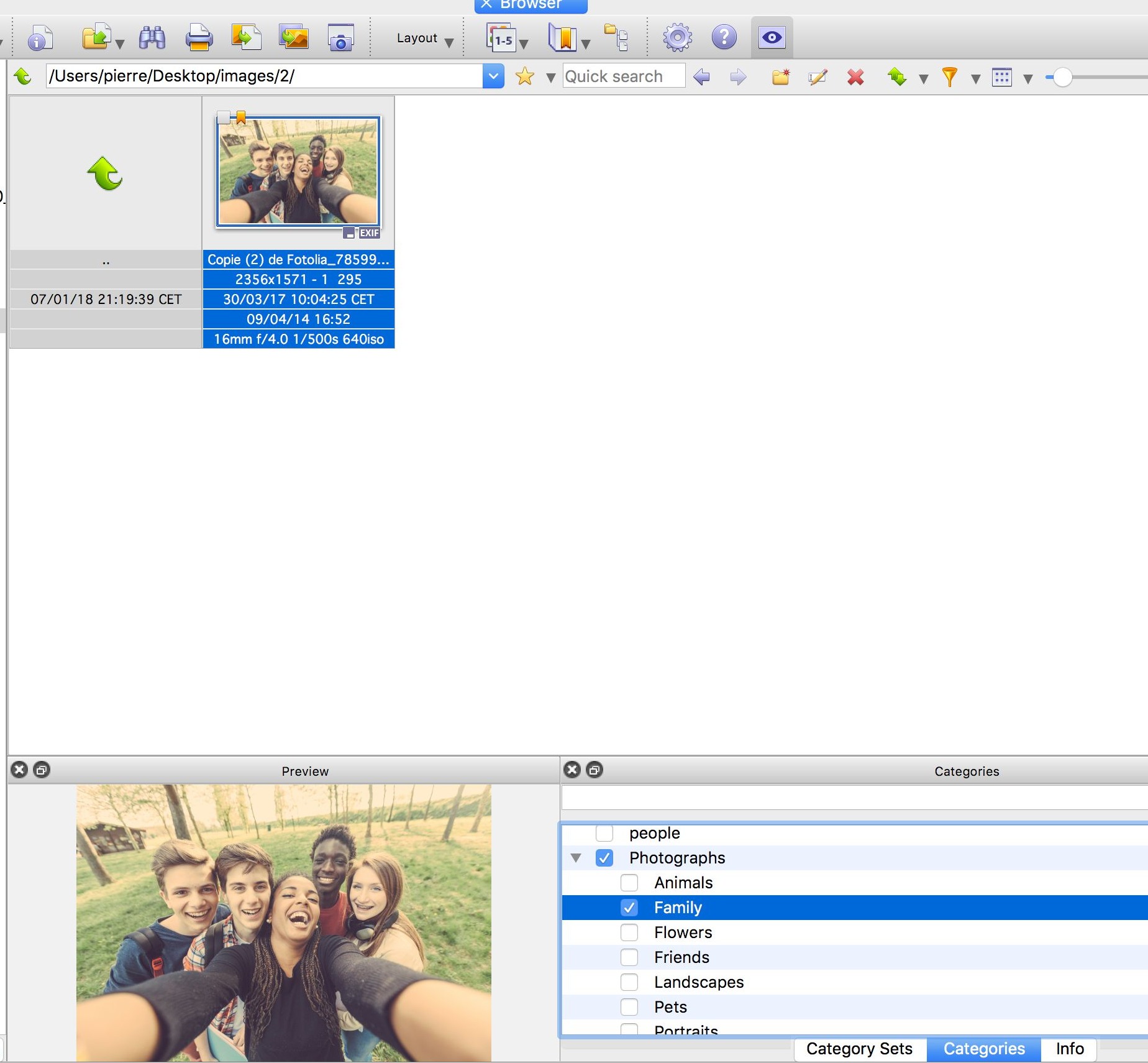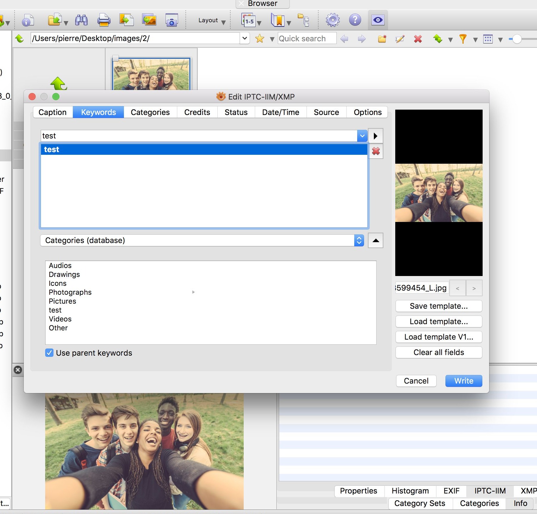 L'indexation via le panneau "catégories" fonctionne, et je le vérifie en cliquant sur "informations" et l'onglet IPTC.