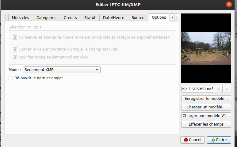Lorsque je souhaite ajouter titre, description, auteur et copyright, à l'aide de la fenêtre Éditer IPTC / XMP, un fichier du même nom que mon fichier mais avec _original après l'extension est créé (un backup de mon fichier). Les informations ne sont pas intégrées au fichier compagnon mais directement dans une fichier qui a été préalablement copié.
