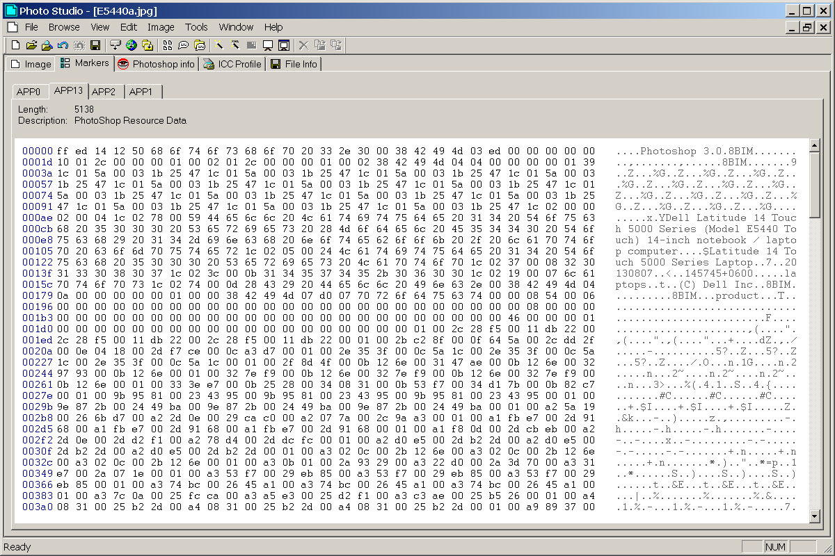 https://www.metacpan.org/pod/Image::MetaData::JPEG::Structures#Structure-of-a-Photoshop-style-APP13-segment wrote:The Adobe's Photoshop program, a de-facto standard for image manipulation, uses the APP13 segment for storing non-graphic information, such as layers, paths, IPTC data and more. The unit for this kind of information is called a "resource data block" (because they hold data that was stored in the Macintosh's resource fork in early versions of Photoshop). The content of an APP13 segment is formed by an identifier string (usually "Photoshop 3.0\000", but also 'Adobe_Photoshop2.5:', used by earlier versions, is accepted; in this case some additional undocumented bytes are read (resolution info?) and saved in a root 'Resolution' record) followed by a sequence of resource data blocks; a resource block has the following structure:(a Pascal string is made up of a single byte, giving the string length, followed by the string itself, padded to make size even including the length byte; since the string length is explicit, there is no need of a terminating null character). The signature (type) is usually '8BIM', but Photoshop used '8BPS' up to version 3.0, and some rogue program (Adobe PhotoDeluxe?) is using 'PHUT' ("PHotoshop User Tags" ?) for path information (ID=7d0-bb7). Valid Image Resource IDs are listed in the Photoshop-style tags' list section. In general a resource block contains only a few bytes, but there is an important block, the IPTC block, which can be quite large; the structure of this block is analysed in more detail in the IPTC data block section.Code: Select all