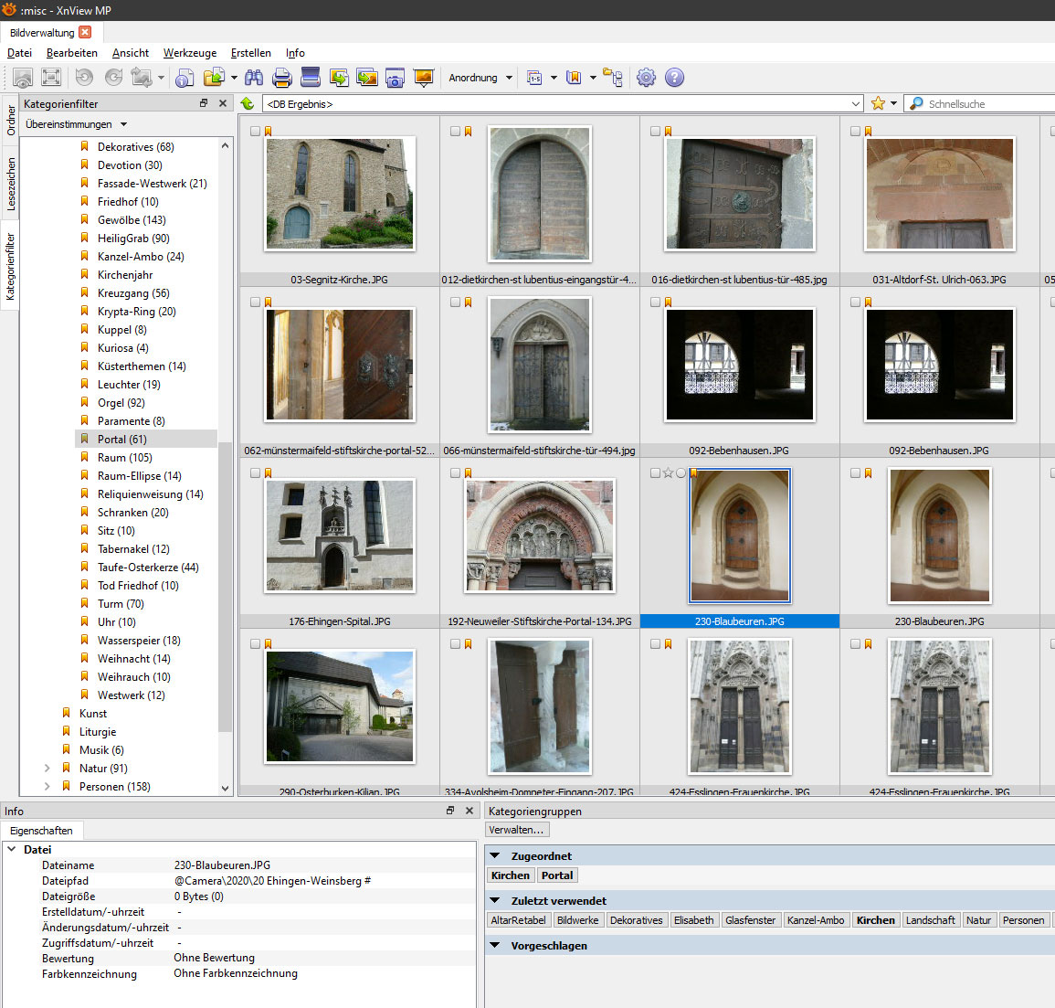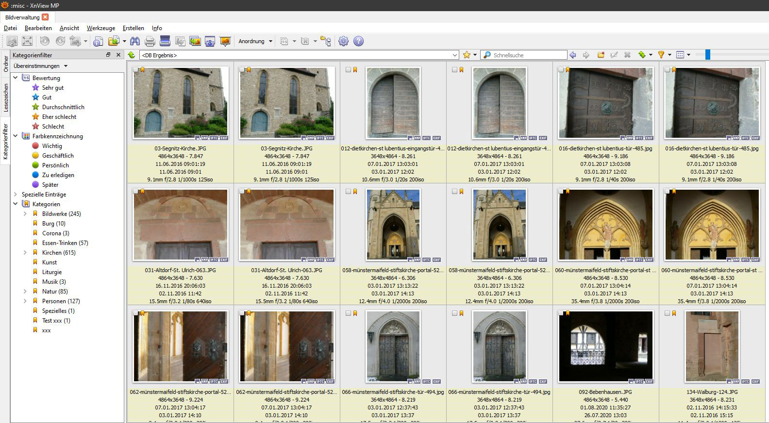 My analysis: The folder in which the images are located has been renamed. XnView shows the image under the old and new folder-name. None can be opened with a double click. This is only a problem with "Kategorienfilter". In the "Ordner"-View it works correct.