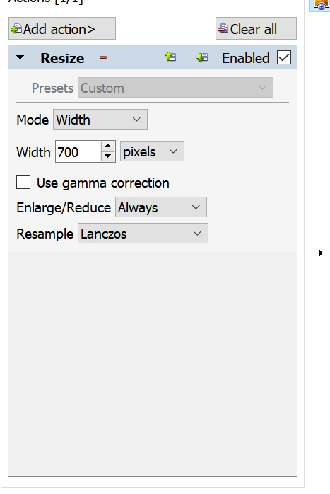 XnView Classic: SHARPEN “built in” in resize image panelhttps://legacy.imagemagick.org/Usage/filter/index.html#lanczos wrote:The “Lanczos” filter basically uses the first “lobe” of the Sinc() function, to window the Sinc() function. That is, the filter's weighting function is used to set the filter's own windowing function. Many people see this as being a good reason to select it over the many other Windowed Sinc Filters. Though there is little to no real evidence that it is the best, it is a solid middle range filter.