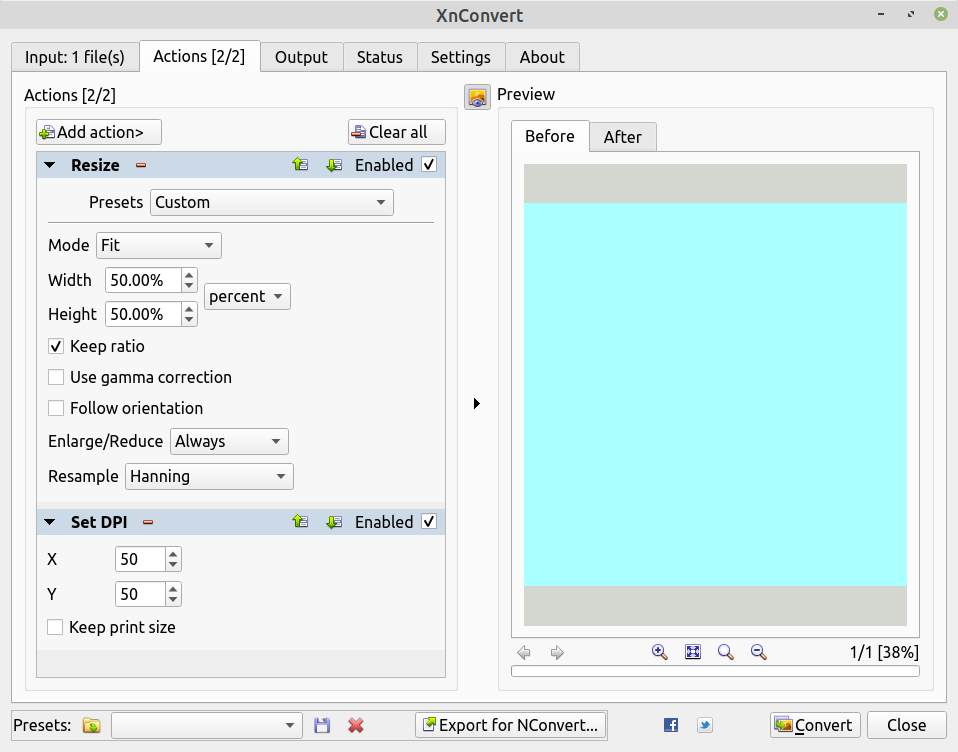 Note that a PDF file does not have a DPI value until it is rasterised when opened in a software, at whatever DPI value is set in the software. To reduce the filesize by reducing the image pixel dimensions resulting when it is opened, while maintaining the print size, it is necessary to consider the DPI value used when the file was opened, and in this case use 50% of that value in the Set DPI action that follows the Resize action.