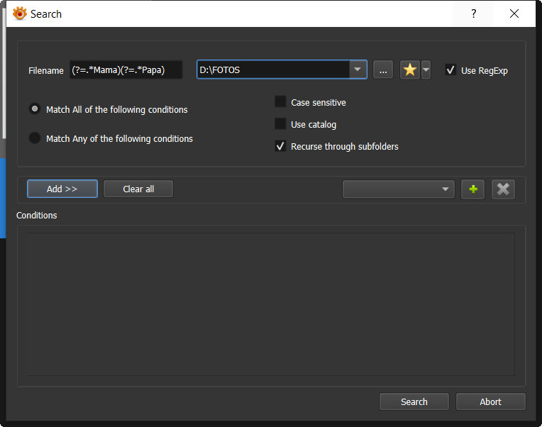 I am sorry, but I do not find any possibility to safe RegExp searches for finding komplex file names.