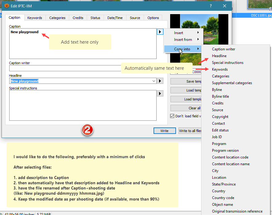 3. have the file renamed after Caption + shooting date (like: New playground-ddmmyyyy hhmmss.jpg)
