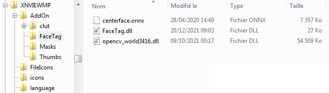 J'ai comparé votre capture avec le dossier XnView > AddOn > FaceTag sur mon PC. J'y retrouve bien les trois fichiers, chacun avec le bon nom (extension comprise) et la bonne taille. Mais FaceTag.dll et opencv_world3415.dll ont pour type ‘Extension de l'application’ au lieu de ‘Fichier DLL’. Une piste ?..