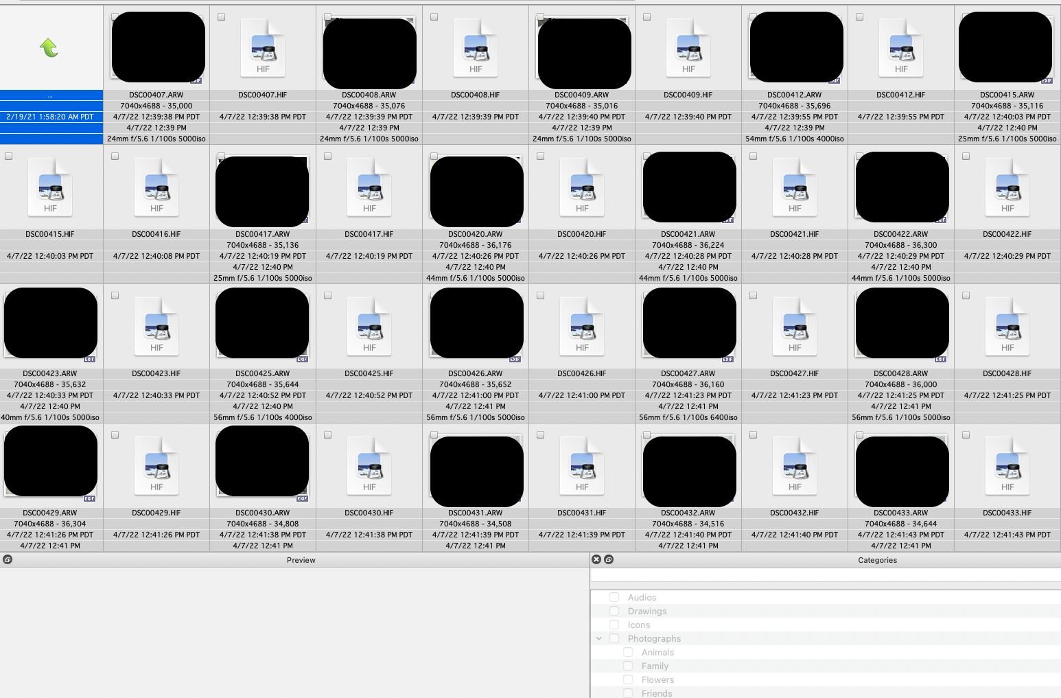 Attached is what it looks like. The raw files I did blackout since those do display and don't want even the thumbs on the Internet.