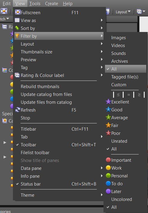 Ok, I will try this as well...BUT Would not it be a nice idea to be able to switch off the category filter with a keystroke? I would very much welcome thatIn Categories filter, there is also a "special item" where you can find "All" . But this one looks for all pictures in the database, and this can take a long while ...