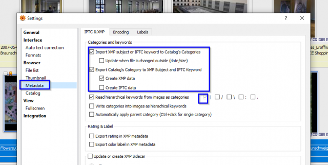 - If you want to change the keywords via "Categories", you also have to activate (Tools>Settings>Metadata>) "Export categories", and "create xmp or iptc "