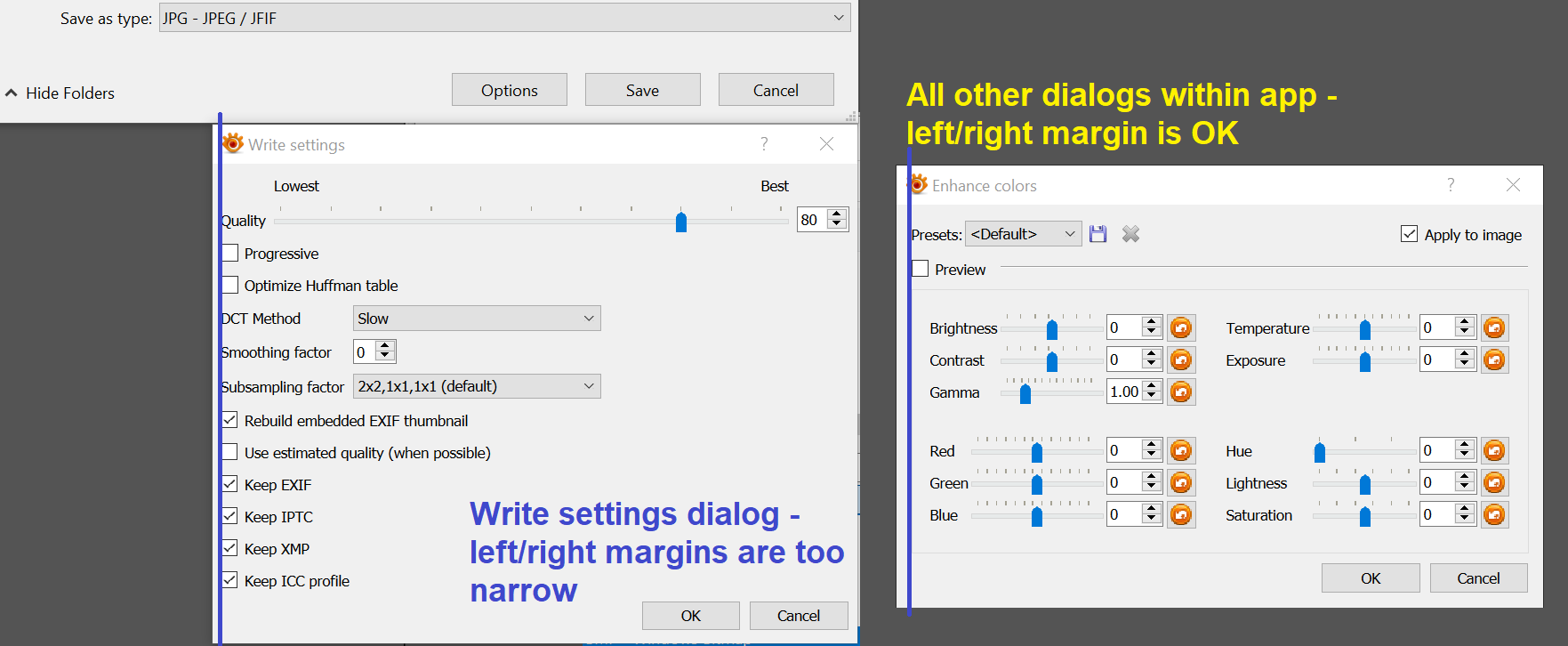 Almost no left/right margins in "Write settings" dialog of "Save as" dialog.