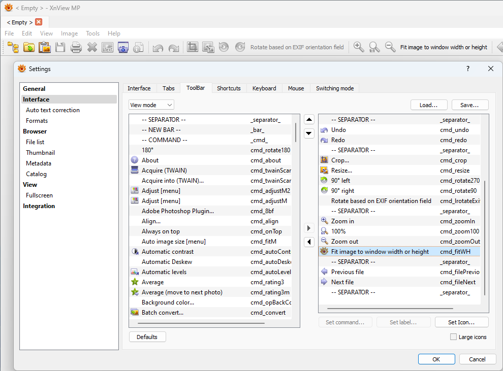 Hello. I am trying XnView MP (version 1.3 64bits) and I have encountered a problem with text labels in toolbar. It's clear to me that if the tool doesn't have an icon (here Rotate based... and Fit image to...), the descriptive text is used...