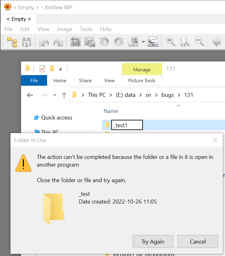 When I open an image with XnView in File Explorer, XnView can no longer delete this directory. Even from outside it is only possible when XnView is closed.