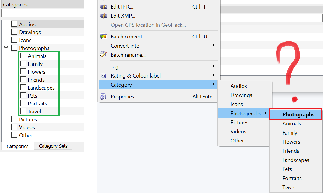 File's context menu (in Browser mode) has extra Category's item in 'Photographs' group.