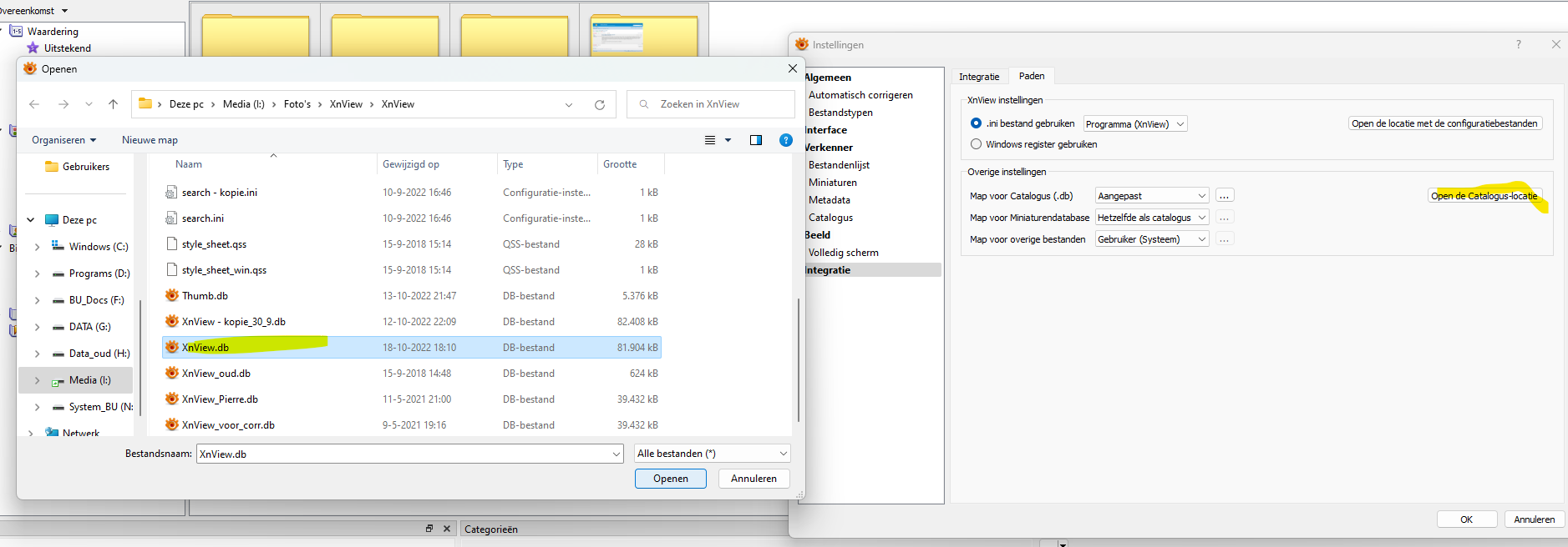 Thanks Pierre for your reactions. With the attached screenshots I'll try to describe the integration settings. My Xnview.ini is in the programsfolder (D:\Programs\XNView). My DB is on a separate partion (I:Media\Foto's\XnView\Xnview) this is stated in the settings and the correct location opens (re screenshot). However, when I click on 'open the Database location' XNview does not seem to 'recall' the location as it opens with the desktop. (re screenshot).