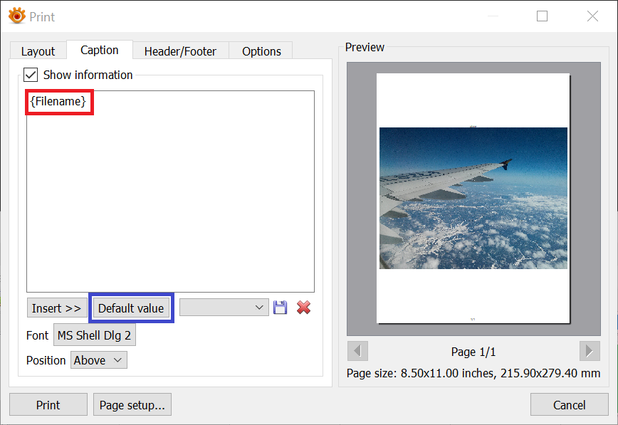 By default Caption set to {Filename}, but when you press 'Default value' button it sets to blank.
