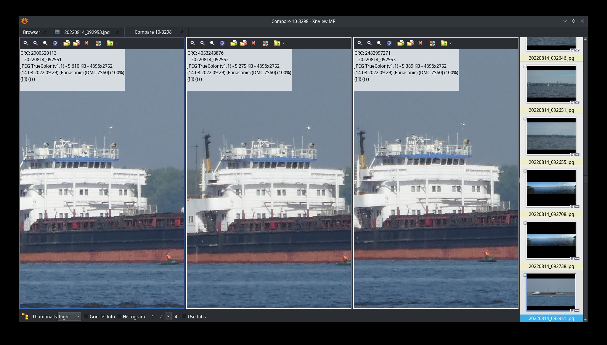 The only thing I'm missing from FastStone image compare is that XnView resets image adjustment position when we change zoom. For example, if we zoom 2 images a lot to see one object that is positioned in different places, we use right mouse click to position the object on both images to the center. and then compare it. Now if we zoom in/out even slightly, out adjustment is reset and we have to adjust again, and it takes very long at higher zoom. Faststone keeps adjustment, so if you move the image so that the object is in the middle on both images, you can zoom in and zoom out, and the object will always remain in the middle. This helps very much to zoom a lot and see what photo has better focus and less blurring.