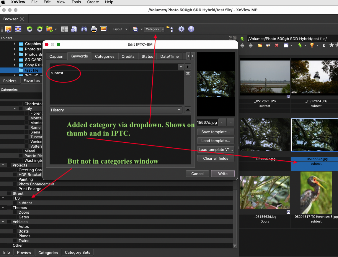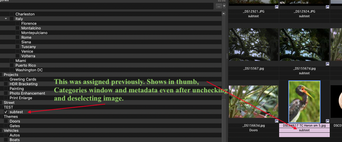 Examples: If I use the category drop down menu in browser mode, I can add a category to a photo and it will show in the meta data. BUT, it will not reflect in the categories window on the info/preview/categories area. Strange. Nor will is show in the category sets area.