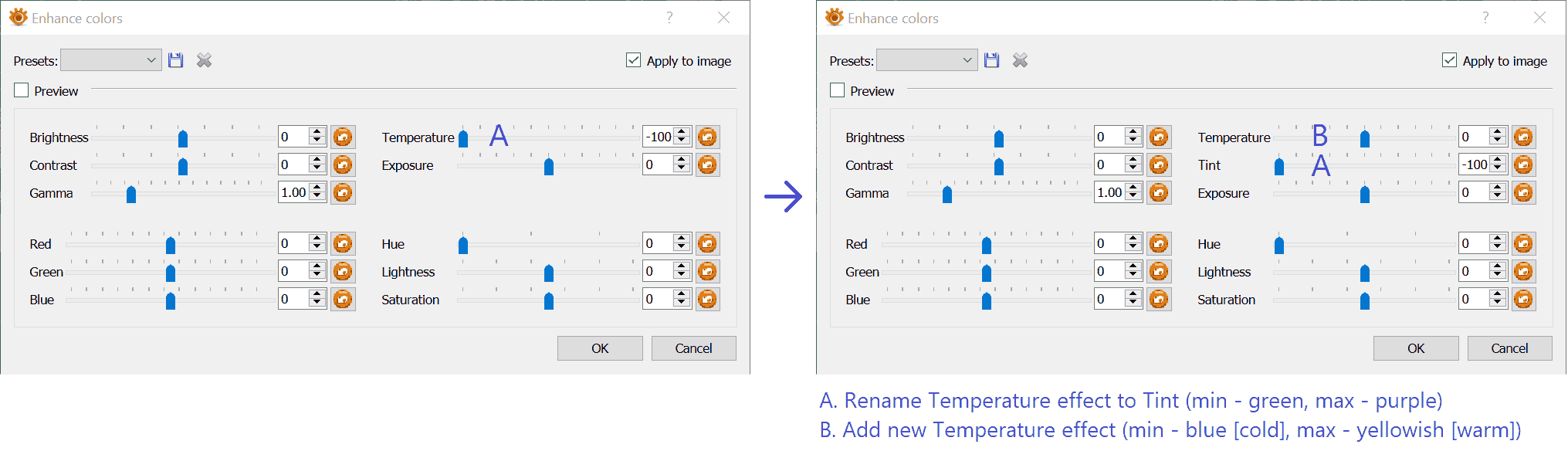 I remember you have mentioned that (some) filters do not work with 8-bit images, but speaking about 'Enhance colors' dialog it looks strange that only Temperature has no effect on such images.