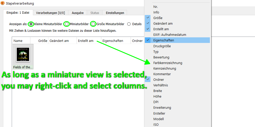Even worse, XnConvert has competely forgotten your prior column selection, instead it's always displaying all the columns.