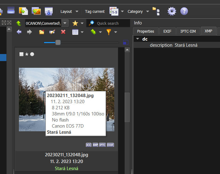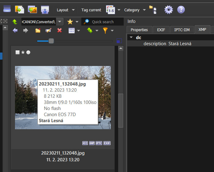 3. I remove the folder with this JPG from the catalog in the Catalog settings, just for the test. When I display the JPG in the browser for the first time, everything is OK. The tooltip and thumbnail label display the XMP:Description ("Stará Lesná" in the image below):